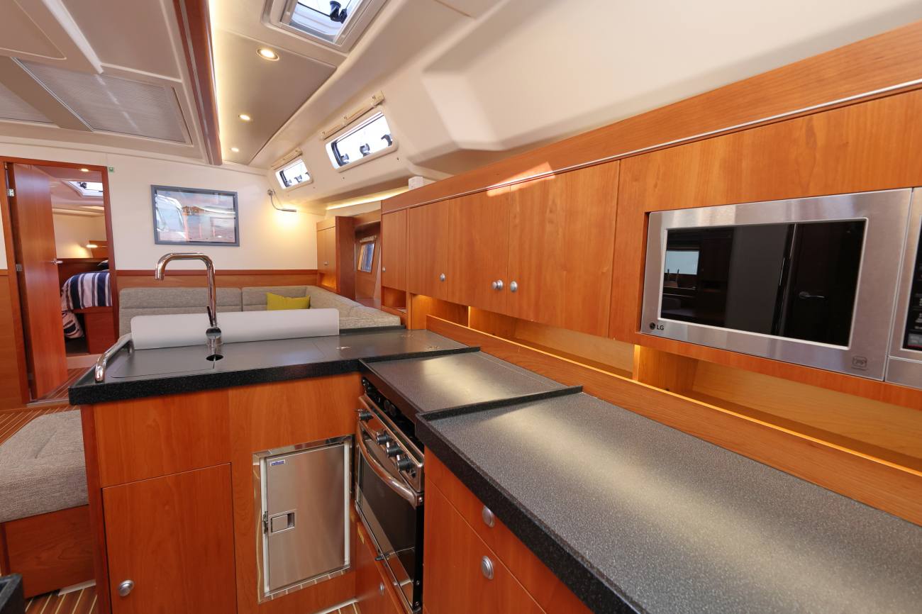 - L shaped galley to starboard aft.