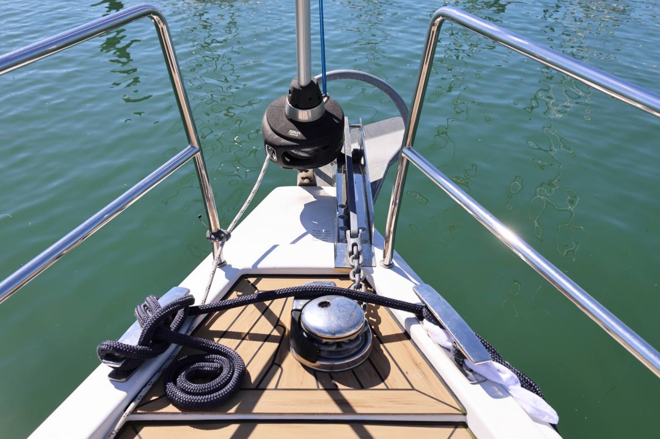 - Foredeck, midship and aft mooring cleats.