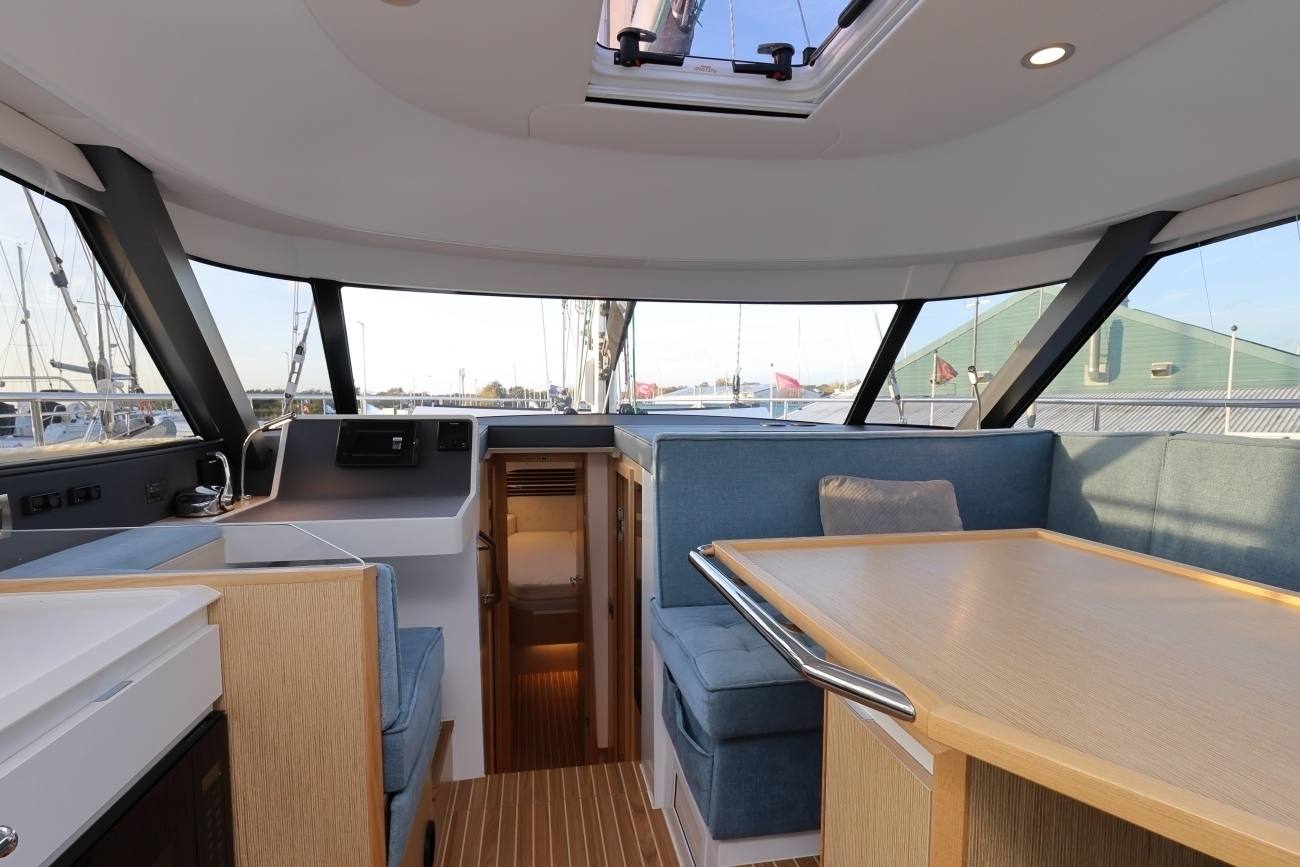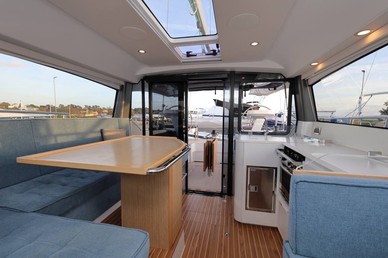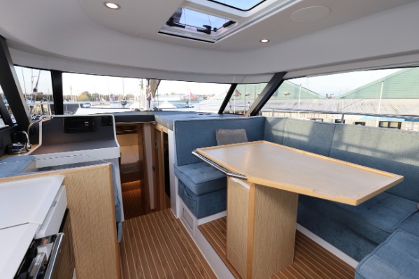 - Saloon sofa seating around a fixed saloon table on starboard side
