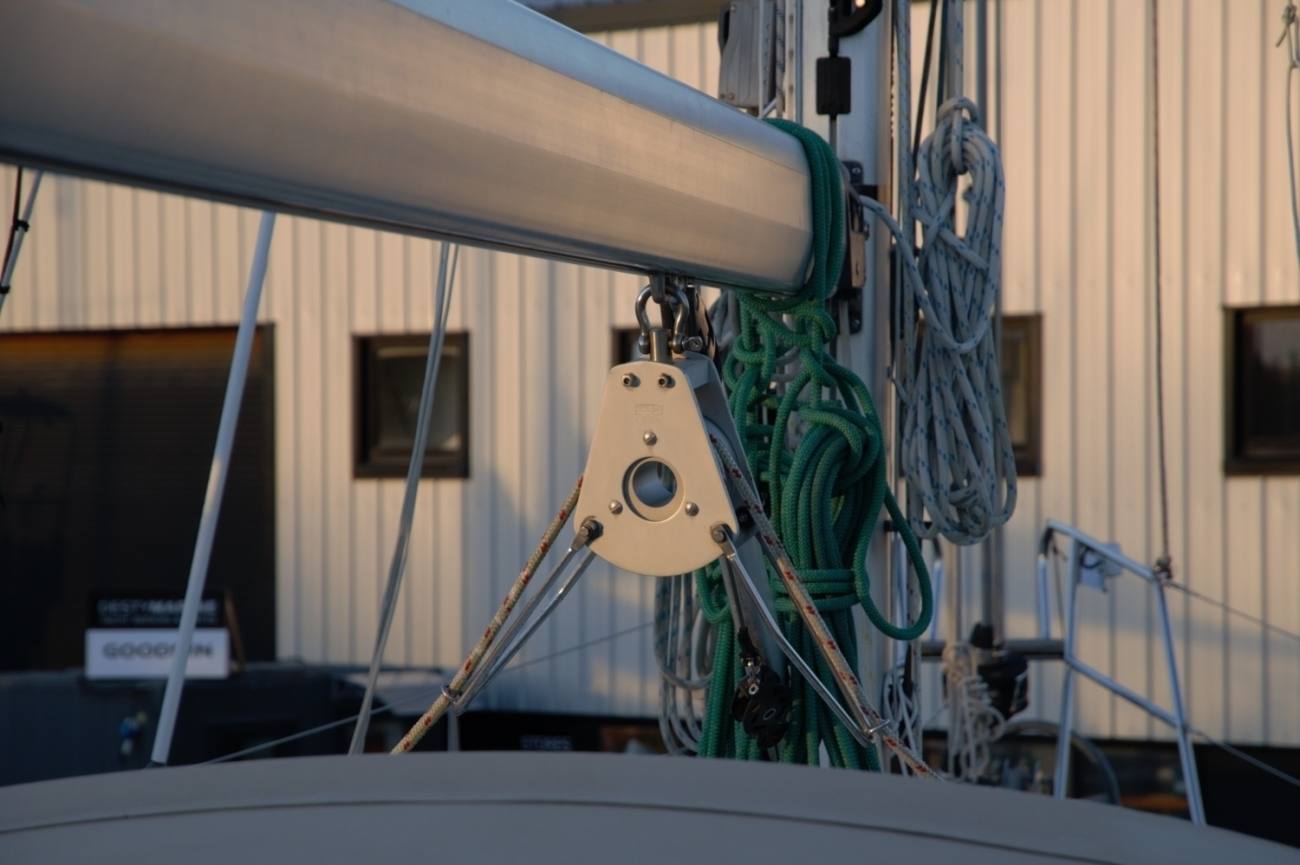 - Running rigging - main halyard, topping lift, vang led aft to cockpit