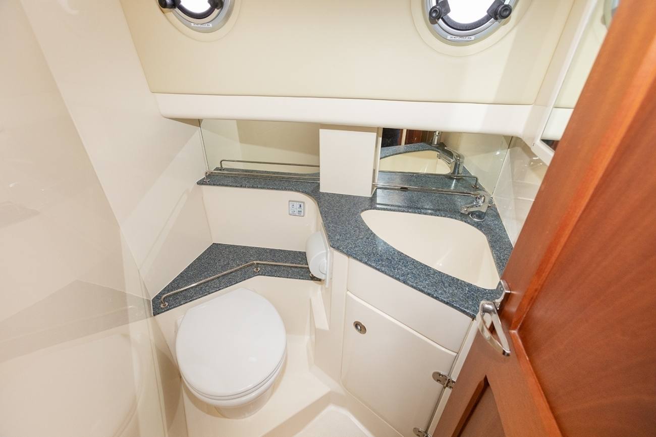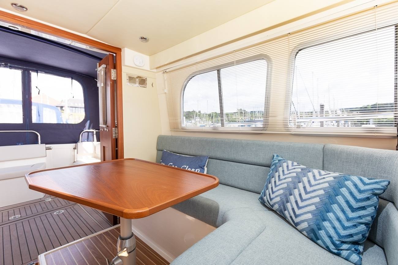 Sleeping four across two cabins she has a functional galley and separate heads unit. A walk-through transom door and sturdy swim platform make stern-to boarding easy and allow swift access into the cockpit. Lightly used this two owner from new example features an upgraded navigation suite and superb new cockpit tent from Saturn Sails.